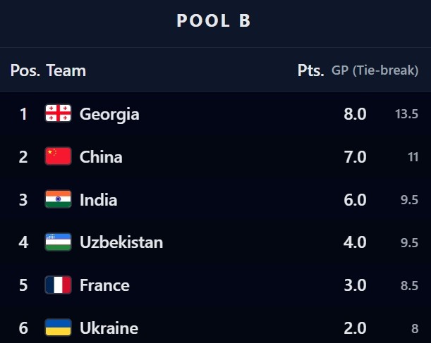 In Pool B stand das Duell zwischen Indien und Usbekistan im Mittelpunkt. Ein 2:2 hätte beiden Teams gereicht, doch die Inderinnen spielten kompromisslos auf Sieg. Den entscheidenden Punkt lieferte Brett vier: WGM Srija Seshadri sicherte mit einem sauber herausgespielten Sieg das 2,5:1,5 und den dritten Platz in der Gruppe.