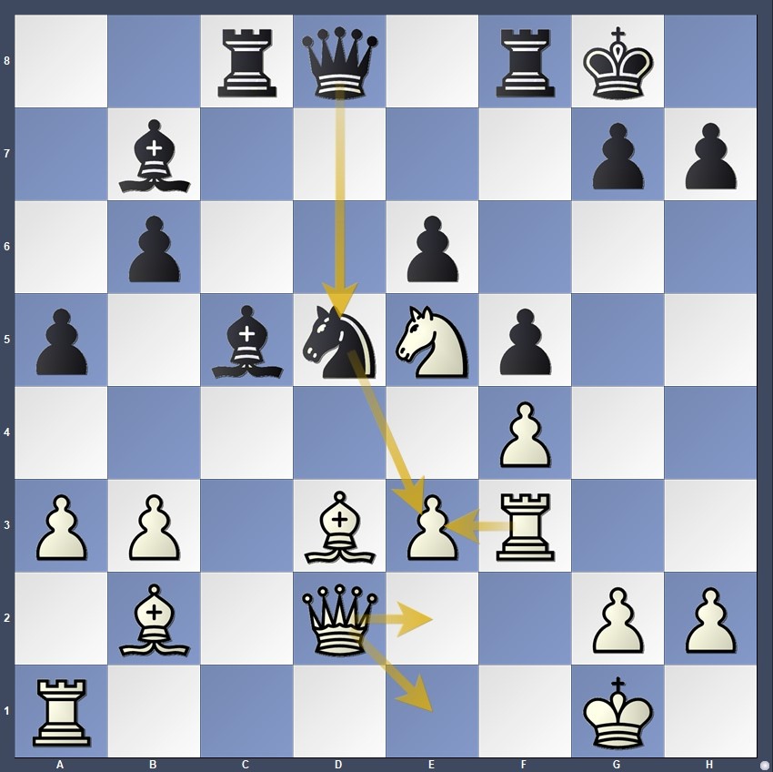 Unter starkem Zeitdruck brach IM Nataliya Buksa (2400) schließlich ein und spielte 18.De1? (der richtige Zug wäre 18.De2 gewesen, was Ausgleich gehalten hätte), wodurch sich eine schöne taktische Gelegenheit bot:
