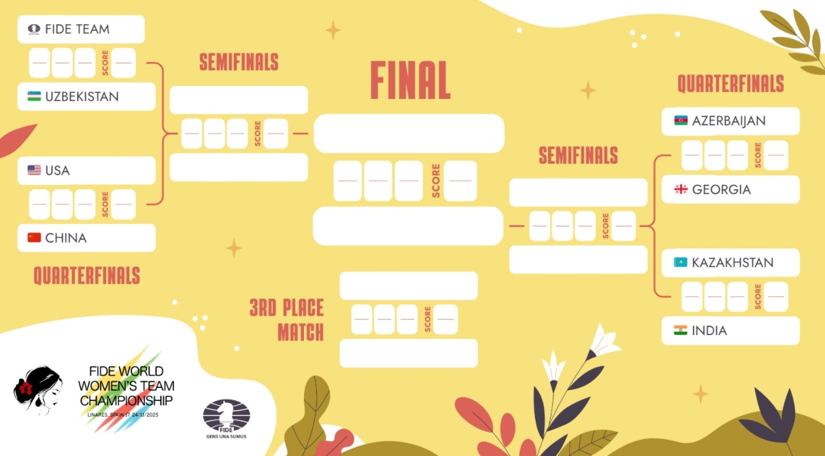 Die Vorrunde der Frauen-Mannschaftsweltmeisterschaft endete am Donnerstag in Linares. das FIDE-Team und Georgien belegten in ihren jeweiligen Gruppen den ersten Platz, und acht Teams qualifizierten sich für die K.-o.-Phase. Die letzte Runde brachte in beiden Gruppen klare Ergebnisse, aber auch einige bemerkenswerte Überraschungen, darunter die Qualifikation Indiens mit einer Ersatzmannschaft und das frühe Ausscheiden der Ukraine nach zwei schmerzhaften Niederlagen. Im Viertelfinale stehen spannende Begegnungen an, allen voran China gegen die USA.