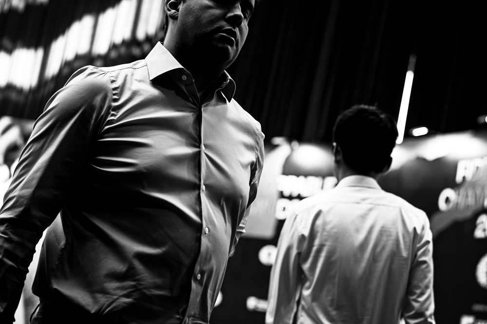29.04.2023 – Nach dem Remis in der am Samstag gespielten 14. Partie zwischen Ding Liren und Ian Nepomniachtchi ist beim Wettkampf um die FIDE-Weltmeisterschaft die Phase mit klassischer Bedenkzeit beendet. Angesichts eines Stands von 7:7 muss die Entscheidung nun in einem Stichkampf gesucht werden, der am Sonntag (11 Uhr deutscher Zeit) in Astana gespielt wird. | Fotos: Stev Bonhage / FIDE
