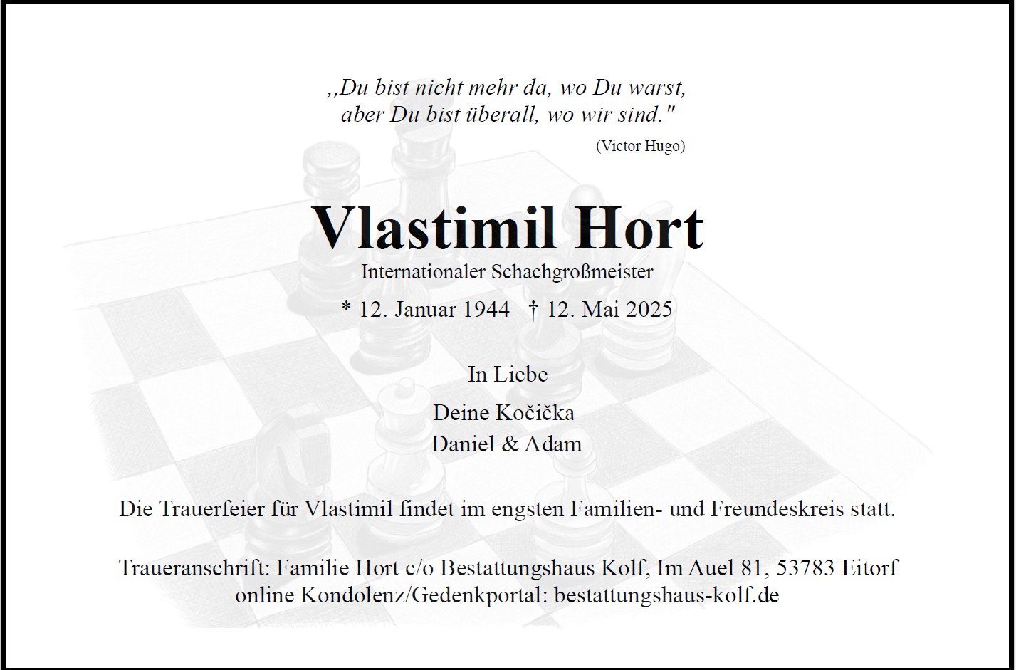 03.06.2025 – Vergangenen Samstag vor acht Tagen fand in Eitorf die Trauerfeier für den am 12. Mai verstorbenen Großmeister Vlastimil Hort statt. Seine Frau Brigitte, sein Sohn und sein Enkelsohn, Freunde und Verwandte nahmen Abschied von diesem liebenswürdigen Menschen. Ein Fan hat seine Trauer auf Youtube in ein Lied gefasst.