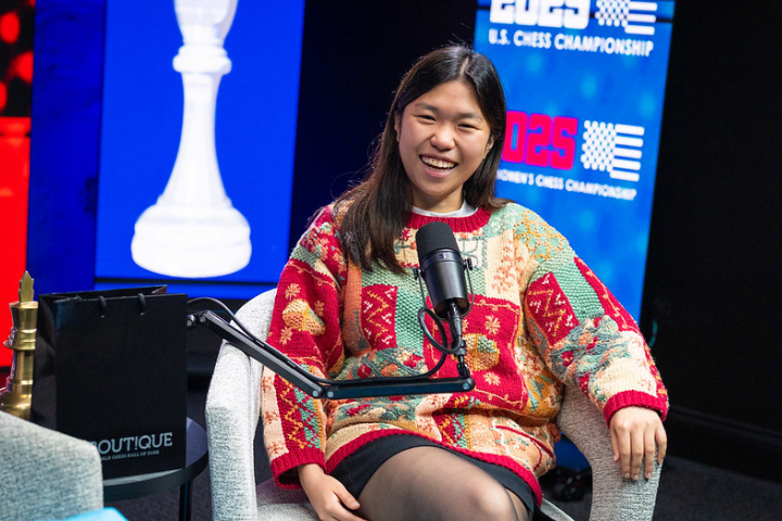 18.10.2025 – Nach Runde 5 der US-Meisterschaften am Freitag ist noch alles offen. Hans Niemann, Fabiano Caruana und Wesley So führen mit 3,5 aus 5 die Tabelle im offenen Turnier an. Durch ihren Sieg gegen Nazi Paikidze führt Alice Lee nun bei der US-Frauenmeisterschaft mit 3,5 Punkten und teilt sich die Spitze mit Anna Sargsyan, die gegen die nominell stärkste Spielerin des Turniers, Carissa Yip, verlor. | Foto: Lennart Ootes, Saint Louis Chess Club