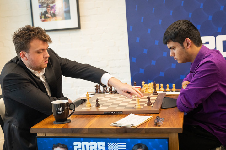 16.10.2025 – Einziger Sieger in der vierten Runde des Opens der diesjährigen US-Meisterschaft war Hans Niemann. Er besiegte mit Schwarz Sam Shankland und liegt damit gemeinsam mit Titelverteidiger Fabiano Caruana und Levon Aronian einen halben Punkt hinter Spitzenreiter Wesley So, der gegen Abhimanyu Mishra remisierte. Im Damenturnier hingegen gab es gleich fünf Siegerinnen. Da die auf Rang 2 liegende Alice Lee gegen Titelverteidigerin Carissa Yip remisierte, konnte die Spitzenreiterin Anna Sargsyan ihren Vorsprung durch den Sieg gegen Megan Paragua bereits auf einen ganzen Punkt vergrößern. Am heutigen Donnerstag ist Ruhetag in St. Louis. | Fotos: Lennart Ootes / St. Louis Chess Club