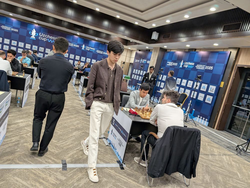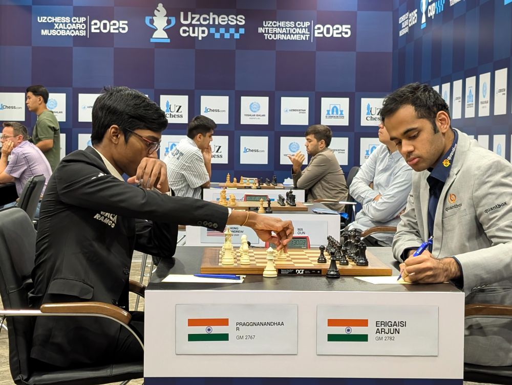 27.06.2025 – Praggnanandhaa Rameshbabu hat seine Chancen auf den Turniersieg beim UzChess Cup durch einen Sieg über Arjun Erigaisi. In der letzten Runde kommt es nun zum entscheidendes Duell zwischen Abdusattorov und Praggnanandhaa. Mit einem Sieg kann Praggnanandhaa Abdusattorov noch einholen. Javokhir Sindarov und Arjun sind die beiden anderen Spieler, die noch Chancen auf den Turniersieg haben. | Foto: sports.uz