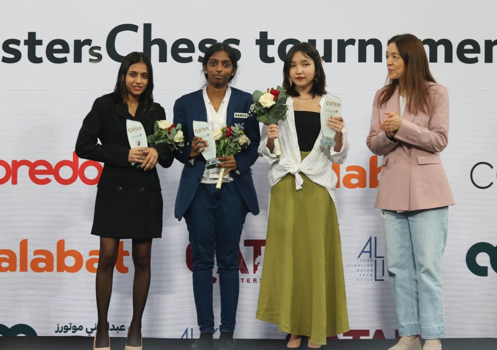 Die besten Frauen beim Qatar Open: 1. R. Vaishali 5.0/9 2. Divya Deshmukh 5.0/9 3. Alua Nurmanova 4.5/9. Zhu Chen gratuliert.