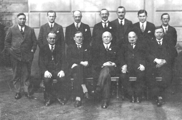 Stehend: Akiba Rubinstein, Friedrich Sämisch, Savielly Tartakower, Christof Jobst, Max Blümich, Lajos Steiner, Frederick Yates, Sitzend: Aaron Nimzowitsch, Alexander Aljechin, Otto Krüger, Walther von Holzhausen, Paul F. Johner. | Quelle: Der Jubiläums-Schachkongress zu Dresden, Ostern 1926: Festschrift des Dresdner Schachvereins, Walter de Gruyter & Co. | Fotoquelle: nimzowitsch.net