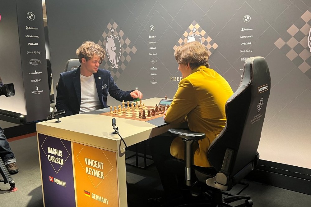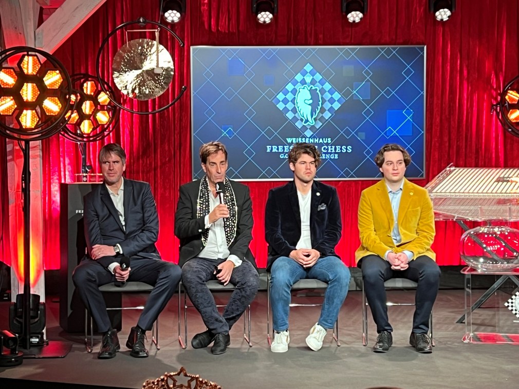 Carlsen, Firouzja, Aronian und Keymer hatten noch am Dienstag und Mittwoch die Finals des Chessable Masters bestritten, ein großes Online-Turnier. Carlsen gewann dort gegen Firouzja in Division I und Keymer gegen Aronien in Division II. Es könnte gut sein, dass alle vier, mindestens aber Carlsen und Firouzja, das Turnier vom Weissenhaus aus gespielt haben und deshalb nur virtuell anreisen mussten, ohne Schneegestöber.