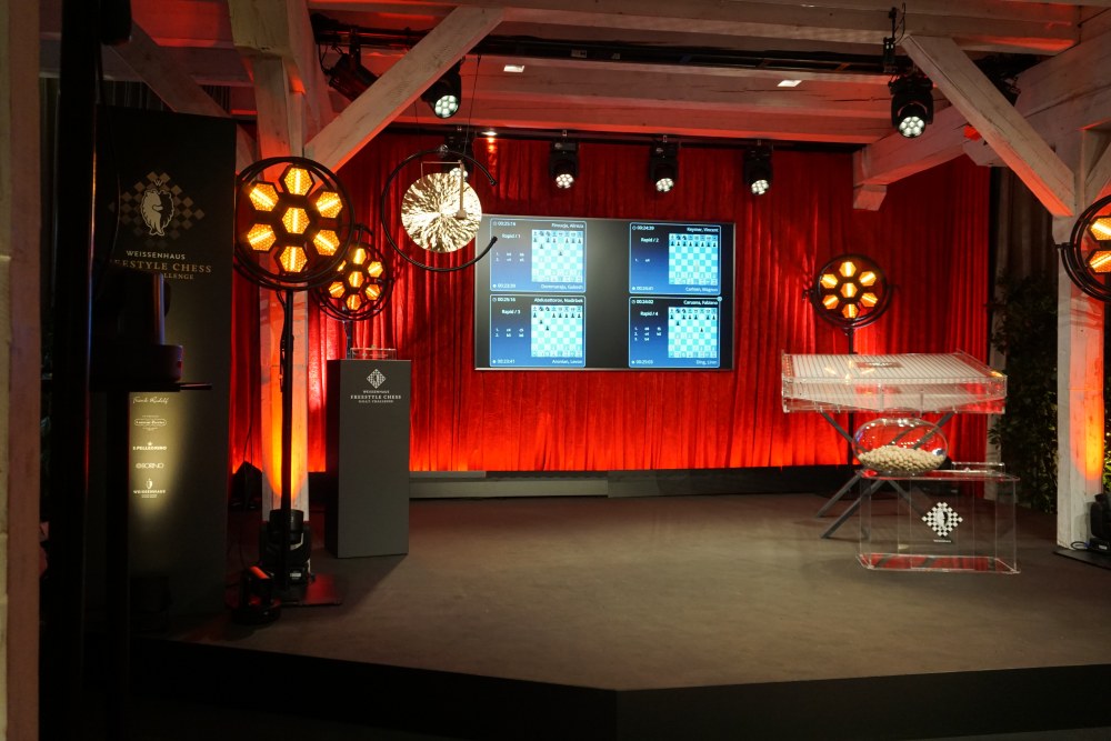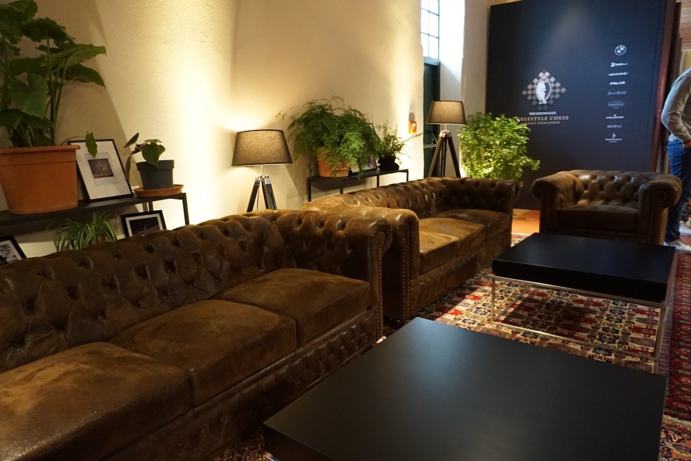Damit die Spieler diese Aufmerksamkeit bekommen, hat Buettner das Turnier von einer erstklassige Kulisse einrahmen lassen. Die Reetscheune, the Barn, ist ein schönes, altes, neues und geräumiges Gemäuer, oben mit einem sehr modernen Tonstudio und im Erdgeschoss mit einer Eventfläche, die mit vielen Details ausgeschmückt, nun ganz im Zeichen des Schachs steht. Die Ausgangsstellungen der Freestyle-Partien werden mit einer eigens dafür gebauten Slotmachine ausgelost.