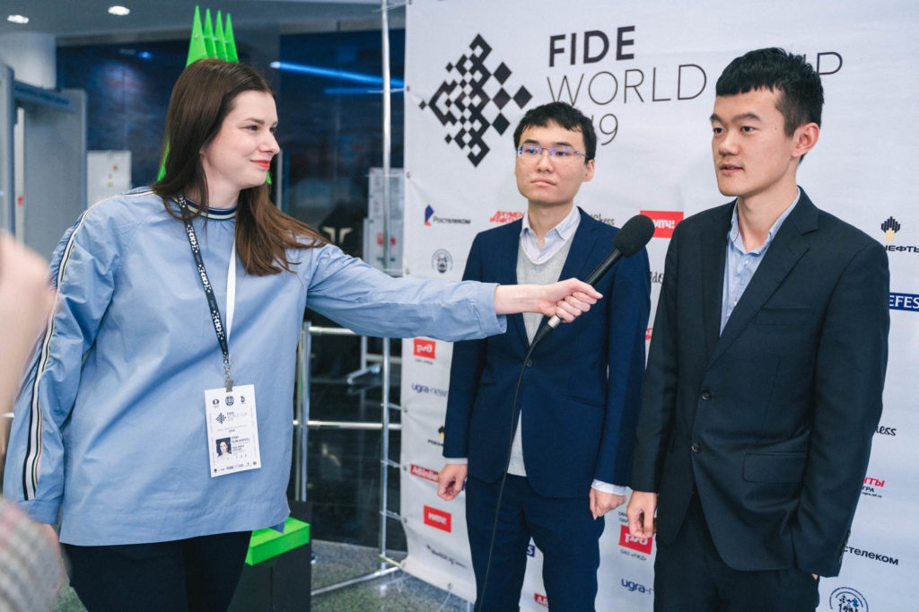 Zwei untadelige Sportsmänner: Die Konstellation war so unglücklich, dass Yu Yangyi (Mitte) seinem Landsmann Ding den Weg zum WM-Match hätte ebnen können. Aber das stand zwischen diesen beiden nicht zur Debatte. | Foto: FIDE