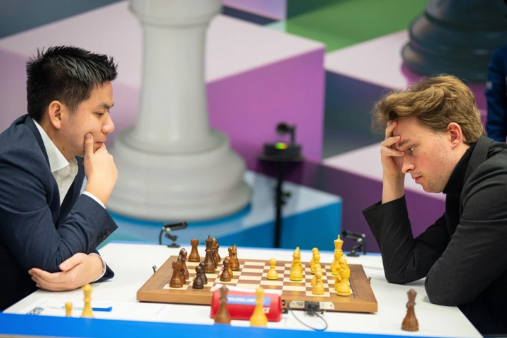 31.01.2026 – Die Bauernstruktur wird zweitrangig, wenn die Stellung auch so gewonnen ist. Hierfür lieferte Vincent Keymer einen schönen Beweis im Endspiel gegen Thai Dai Van Nguyen, welches Keymer gewann. Durch diesen Sieg behält er noch Chancen auf die Tabellenführung. Matthias Blübaum hingegen begegnete einem aktiven Springerpaar von Abdusattorov und musste mit dem Material und der Partie auch die Chancen auf einen Turniersieg abgeben. Sindarov ging ein schnelles Remis gegen Praggnanandhaa ein, wodurch Abdusattorov nun alleine führt. | Foto: Lennart Ootes / Tata Steel Chess Tournament