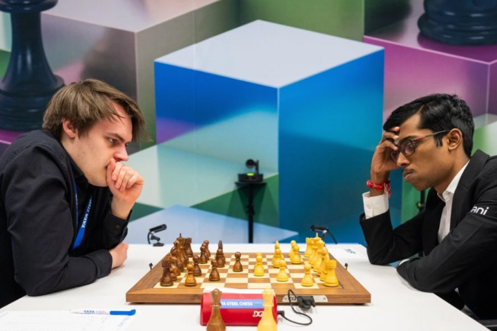 18.01.2026 – Das Tata Steel Chess Tournament 2026 begann am 17.1.26 aufgrund einer Demonstration vor dem Spielort mit einer Verzögerung von 1,5 Stunden im niederländischen Wijk aan Zee. Kaum waren die Partien im Masters- und Challengers- Turnier gestartet, da stand auch schon ein Ergebnis fest: Hans Niemann siegte in nur 16 Zügen gegen Vladimir Fedoseev. Früh endete auch die Partie zwischen Vincent Keymer und Anish Giri. Durch eine Taktik wurde die Partie zugunsten von Keymer entschieden. Ein Highlight: World Cup Sieger Javokhir Sindarov erkämpfte sich ein Remis mit Weltmeister Gukesh. | Foto: Lennart Ootes/ Jurrian Hoefsmit, Tata Steel Chess 2026