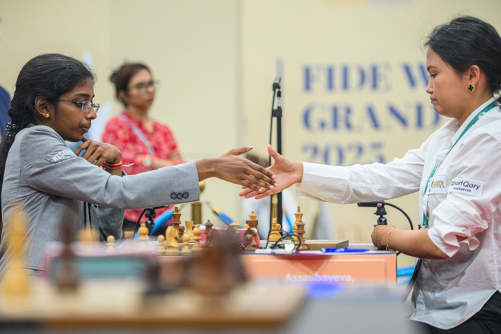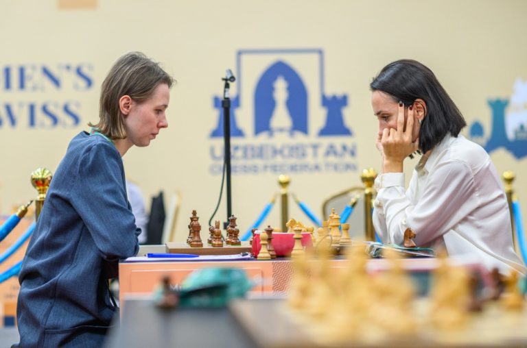 Im Women’s Grand Swiss endete die tolle Serie der Inderin Vaishali Rameshbabu: In Runde 8 musste sie nicht nur die erste Niederlage verkraften, sie verlor dadurch auch die Tabellenführung. Die Niederlage gegen Bibisara Assaubayeva (Titelfoto) resultierte aus einer Unachtsamkeit, die sie die Initiative kostete.