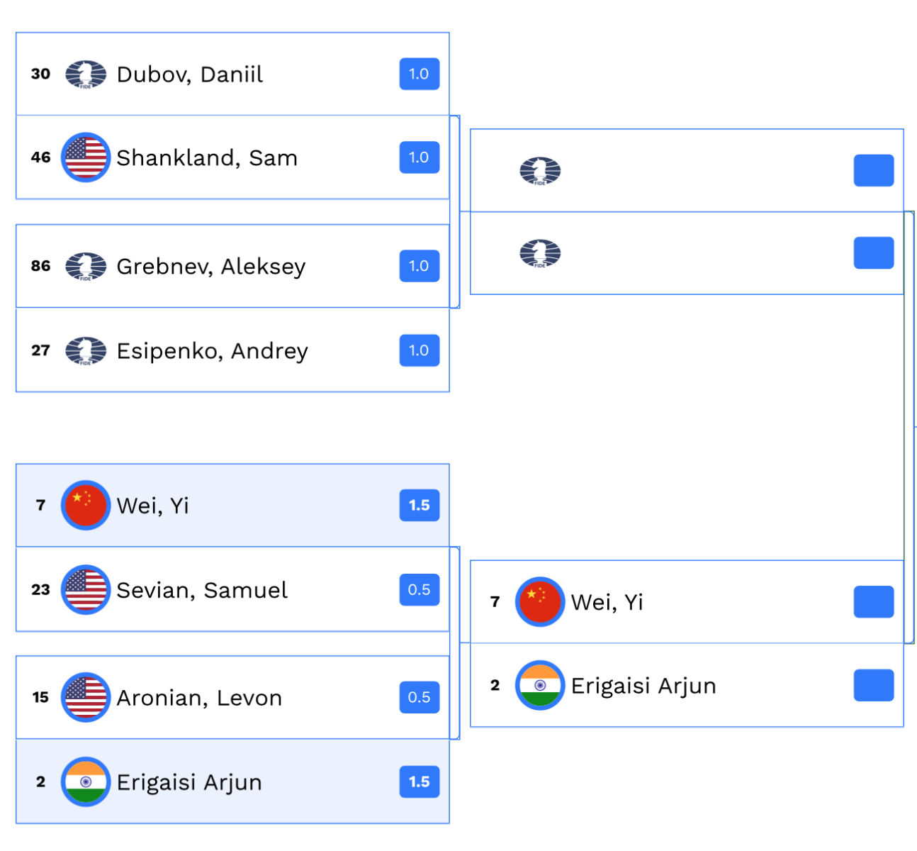 Arjun Erigaisi konnte als erster Inder des Turniers ins Viertelfinale einziehen. Harikrishna kann ihm noch folgen. Als Weltklasse-Spieler und Top1 Indiens (nach Elo) liegt auf Erigaisi der Druck, nachdem andere indische Top-Spieler wie Gukesh das Turnier bereits vorzeitig verlassen mussten, im World Cup die großen Ergebnisse einzufahren. Nach einem Remis in Spiel 1 der Runde 5 gegen Levon Aronian schaffte Erigaisi einen Sieg in Spiel 2 und sorgte so dafür, dass Aronian das Turnier bereits beenden musste.