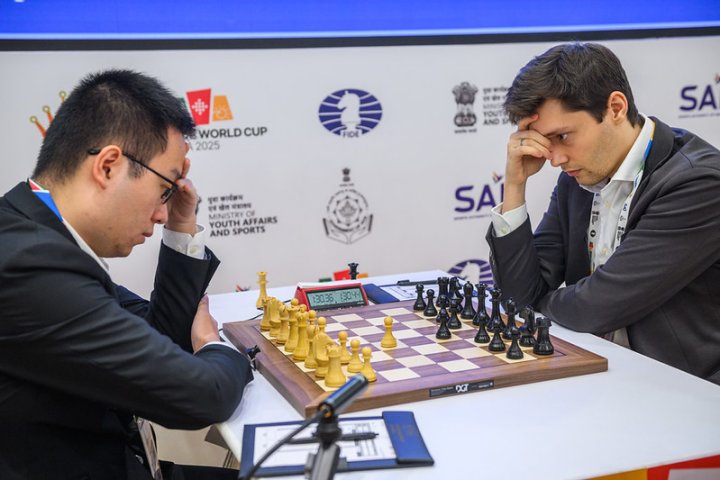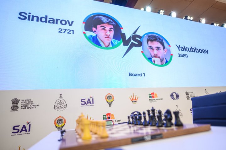 21.11.2025 – Das Halbfinale des World Cups in Goa begann ruhig. Wei Yi, der mit Weiß gegen Andrey Esipenko spielte, fand kein überzeugendes Konzept gegen die kluge Eröffnungswahl seines Gegners und musste am Ende über ein Remis froh sein. Auch Nodirbek Yakubboev konnte seinen Anzugsvorteil gegen Javokhir Sindarov nicht nutzen. | Foto: Michal Walusza