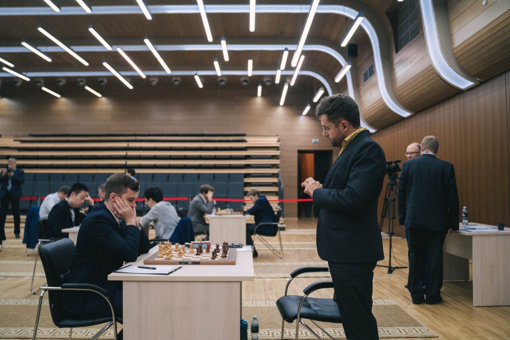Eine ausgesprochen glatte Promotion in die 4. Runde feierte Alexander Grischuk gegen den Chinesen Xu Xiangyu. Grischuk gewann beide Partien, heute mit Weiß.