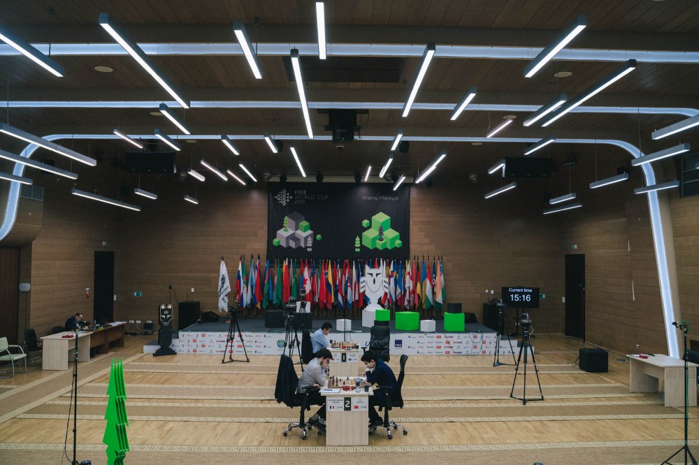 02.10.2019 – Ist das Marshall-Gambit doch nicht unverwundbar? In der dritten Finalpartie gelang Teimour Radjabov heute ein Sieg mit der Spanischen Partie gegen Dings Marshall-Gambit. Radjabov glich damit aus. Yu Yangyi und Maxime Vachier-Lagrave spielten im Kampf um Platz drei auch die dritte Partie remis.| Fotos: Kirill Merkuryev (FIDE)