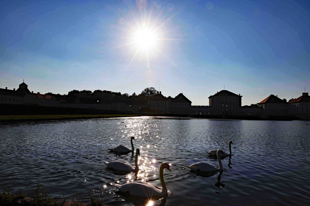 Generalkonsul Tong Defa (links) und Xue Zhong (rechts) werben für das Xiangqi Event im Schloss Nymphenburg. Rechts: Schwäne vor dem Schloss Nymphenburg