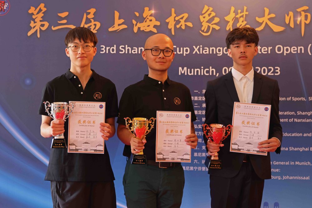Die Sieger des Masters: Gold für Xiangqi-Europameister Xue Handi (mitte), Silber für Xu Haoyang (links) und Bronze für Nikola Martinovic (rechts)