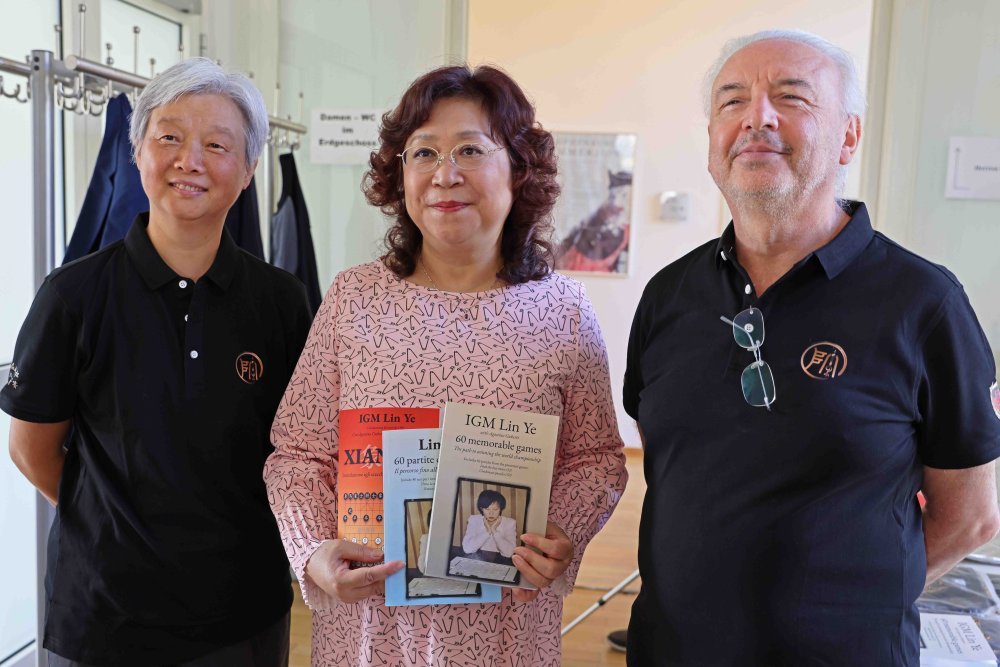 Lin Ye (Ex-Xiangi-Weltmeisterin 1997, links im Bild) überreicht Shan Xiali ihre „60 memorable games“ in mehreren Sprachen, u.a. in Englisch. Rechts im Bild Lin Yes Ehemann Agostino Guberti, Gründungspräsident der italienischen Xiangqi Federation und Co-Autor. Englischsprachige Xiangqi-Bücher gibt es nur wenige auf dem Büchermarkt. Noch seltener sind Bücher für Fortgeschrittene. Lin Yes Buch schließt diese Lücke.