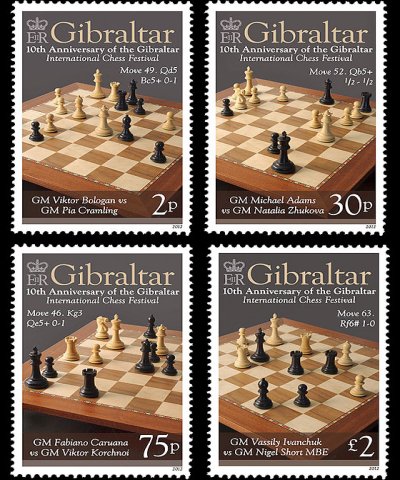 Gibraltar ehrte GM Pia Cramling mit einer Briefmarke in einer Sammlung von vier Briefmarken zur Feier des 10-jährigen Bestehens ihres Schachfestivals.